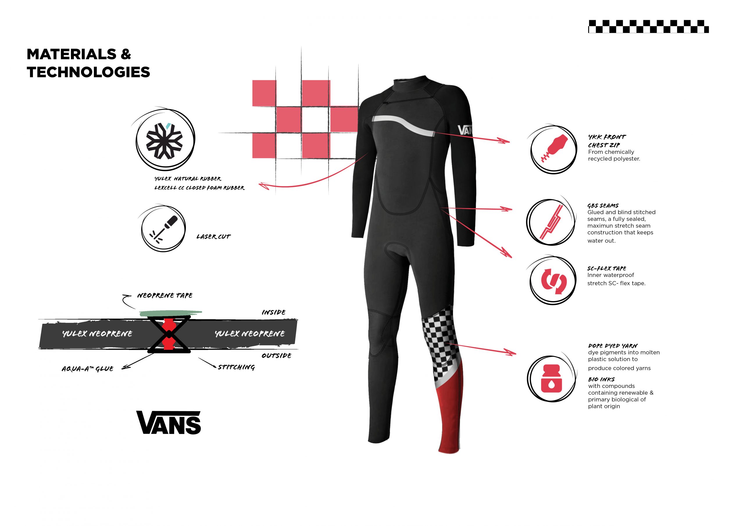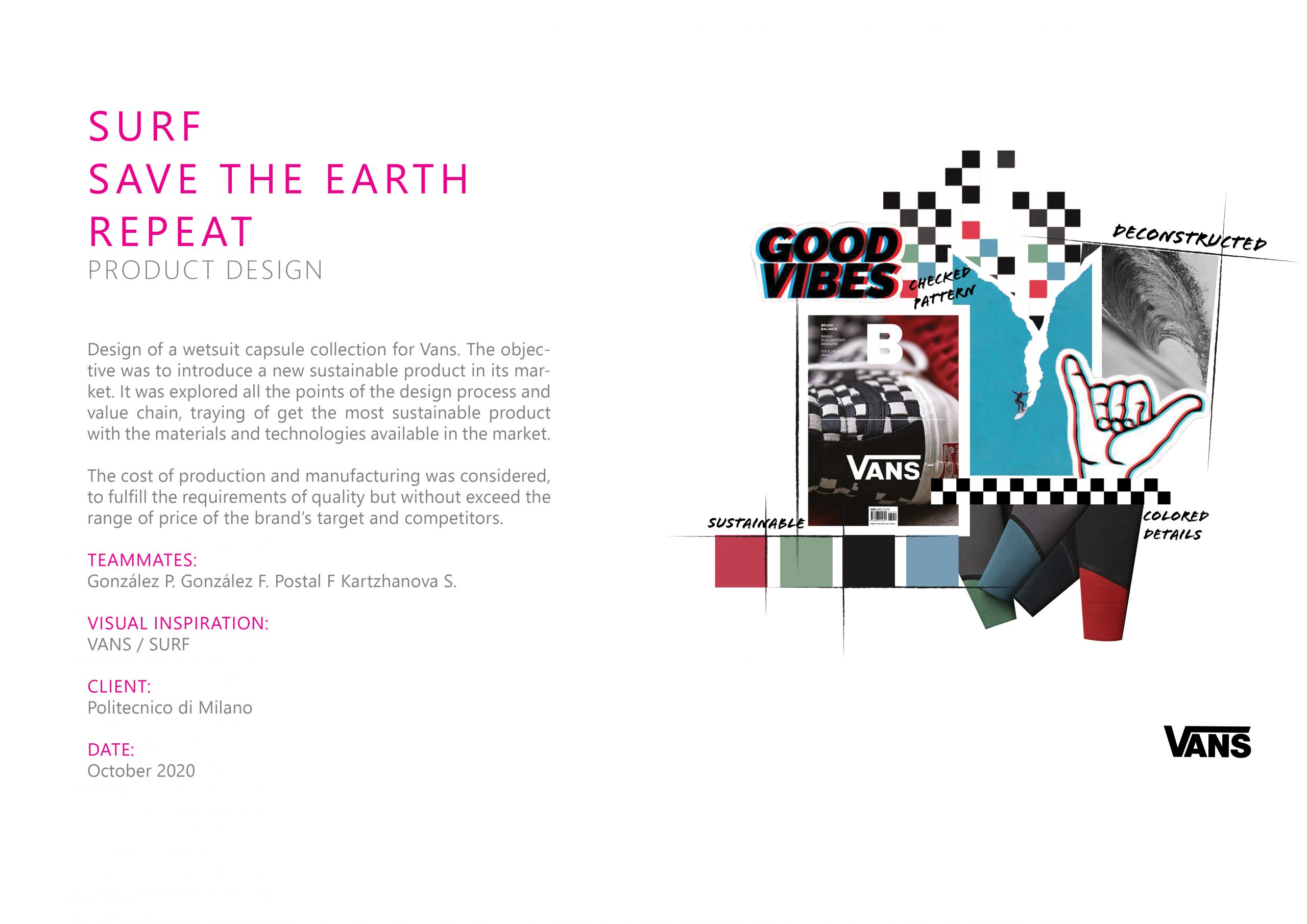Design of a wetsuit capsule collection for Vans. The objective was to introduce a new sustainable product in its market. It was explored all the points of the design process and value chain, traying of get the most sustainable product with the materials and technologies available in the market.